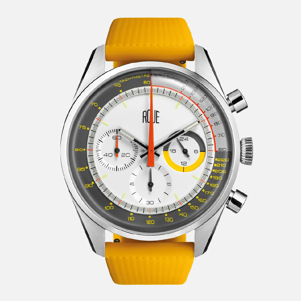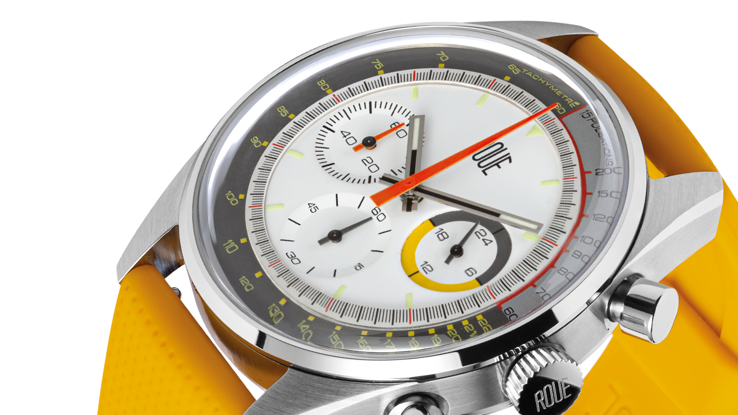 - Hours, minutes, seconds, chronograph minutes, am/pm